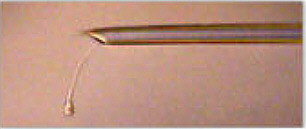In the laboratory, the follicle cells are removed from around each egg with an enzyme solution. One by one, the naked eggs are held by gentle suction on a glass holding pipette, and a single sperm is injected. The tiny glass needle containing the sperm is gently pushed through the shell of the egg and the sperm is deposited in the egg cytoplasm.